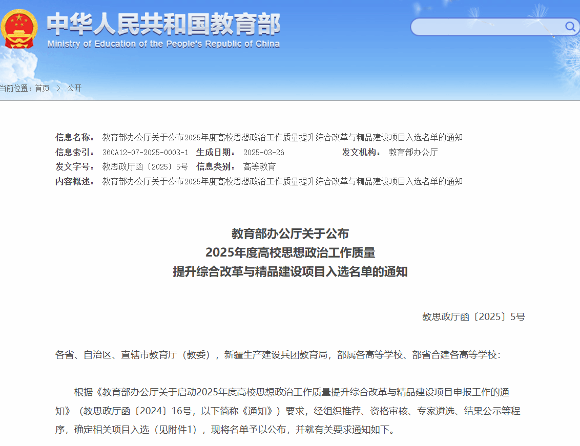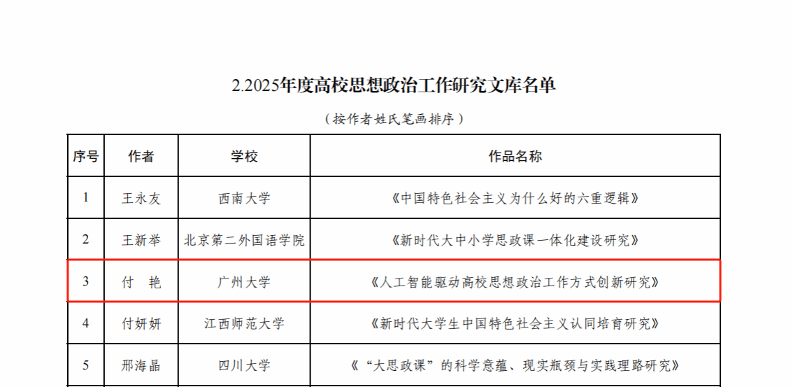 2025年3月25日,教育部办公厅公布了2025年度高校思想政治工作质量提升综合改革与精品建设项目入选名单的通知。我院党委付艳副书记主持的《人工智能驱动高校思想政治工作方式创新研究》入选2025年度高校思想政治工作研究文库。