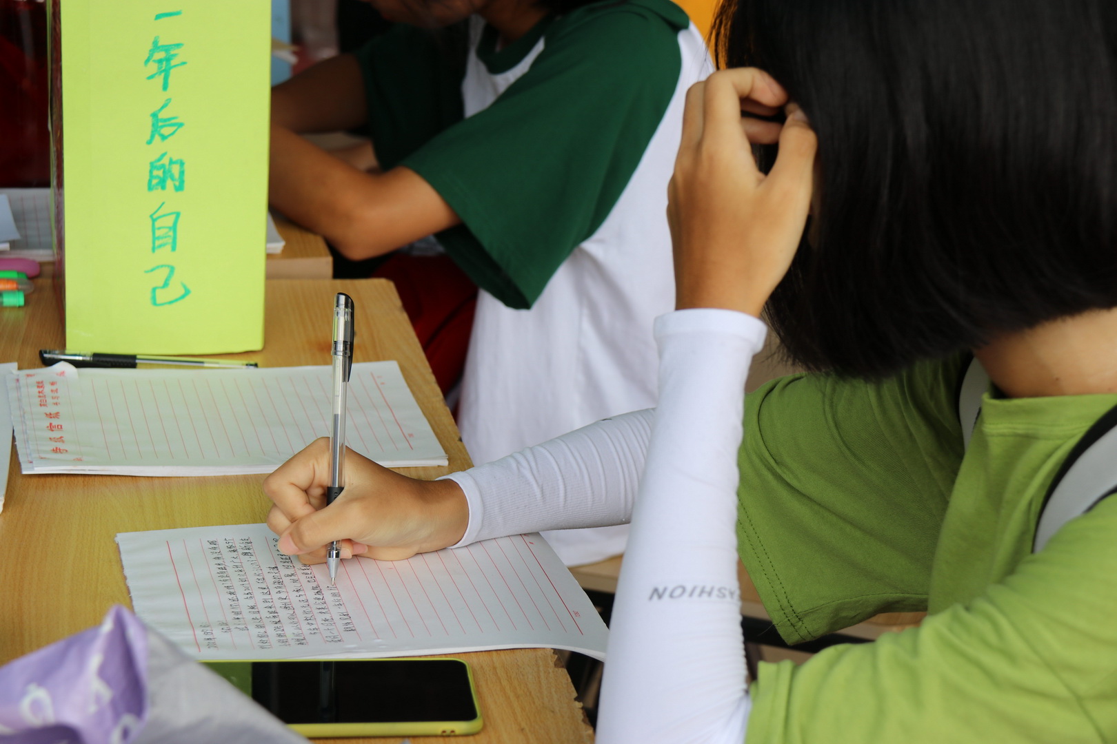 在这热闹的架空层中,也有安静的一角。在这里,工作人员设置了一个写信角。一年后的你会在哪里?完成了什么了不起的事情?你希望一年后的你是怎样的?对一年后的自己想说的话,你都可以写下来。同学们收起了玩游戏时的调皮神色,认真地一笔一划书写着这封在一年后将被重新打开的信。希望一年后拿到信的你,是信里描绘的模样。