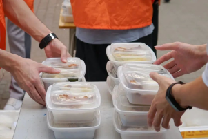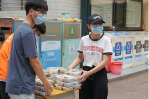 志愿者们正在发放物资,同学们有秩序领取物资。