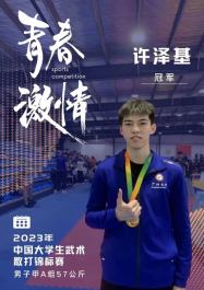 2020级经济202班的学生许泽基实力超群,在与大连民族大学、西安电子科技大学以及中南财经政法大学的角逐中脱颖而出,斩获甲A组男子57公斤冠军。
