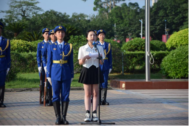 上午7时10分,升旗仪式正式开始。国旗护卫队昂首挺胸,以坚定有力、整齐划一的步伐护送国旗、校旗走至升旗台前。随后,《义勇军进行曲》激昂响起,全体师生静立。铿锵的国歌声中,师生们神情肃穆地注视国旗冉冉升起,迎风飘扬。