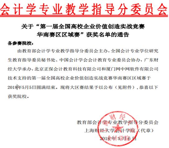 全国高校企业价值创造实战竞赛是由教育部会计学专业教学指导分委员会主办,全国会计专业学位研究生教育指导委员秘书处、中国会计学会会计教育专业委员会协办的面向全国大学生年度性大型财会赛事。大赛秉承“以赛促教、以赛促学”精神,旨在促进各高校紧跟时代步伐,改革教学内容及教学模式,顺应时代需求,推动全国高校财会类专业的教学改革。