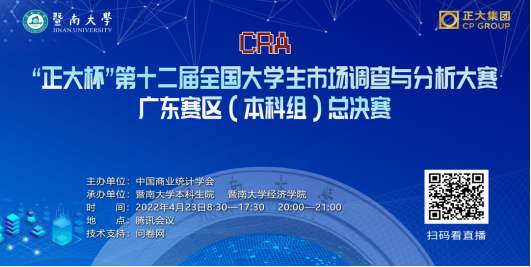 2022年4月23日,“正大杯”第十二届全国大学生市场调查与分析大赛广东赛区(本科生组)总决赛在腾讯会议线上举行。我校共有三支队伍进入广东赛区决赛,经过文档评审及现场答辩,我校队伍分别获得广东赛区(本科生组)总决赛第四名、第八名和第二十一名的好成绩。