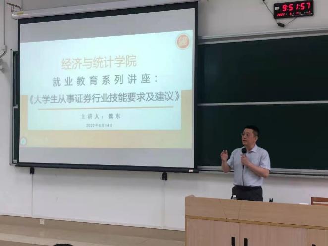 学生开展职业规划教育系列活动暨“大学生从事债券行业技能要求及建议”讲座。魏东经理有二十多年证券从业投资经历,市场分析经验丰富,擅长大盘分析和题材板块研究。讲座由国贸系陈喜强老师主持,学院副院长邹文理、国贸系和金融系相关负责老师、辅导员张静静及色漫网