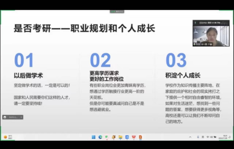 为提高学生报考研究生的积极性,国贸系于7月25日和7月28日通过腾讯会议组织两场分享会,并邀请2022届考上研究生的陈健聪、黄子娴和陈楚如校友做经验分享。三位校友分别被本院应用经济学专业、辽宁大学经济学院和暨南大学经济学院录取。