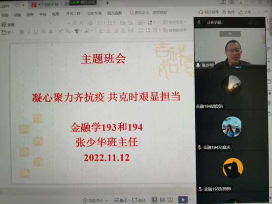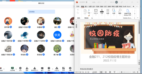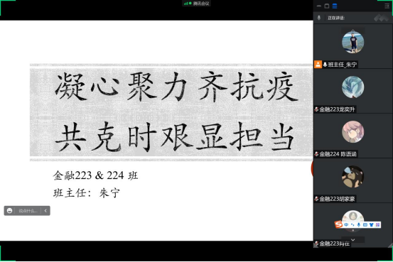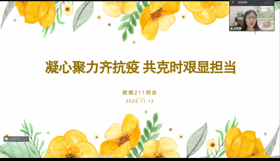 本次主题班会使同学们深刻认识到了当前疫情防控形势的严峻性及重要性,体会到学校及学院各级领导老师,服务学生、关心学生、爱护学生、心系学生的情怀和担当,有效引导同学们积极进行自我调节,合理规划静态管理期间的学习生活,统一思想、坚定信念,为学校的疫情防控工作起到了积极的推动作用。