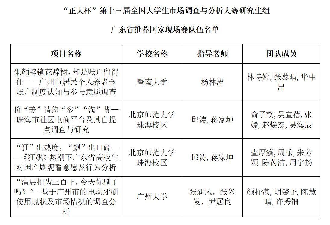 第十三届全国大学生市场调查与分析大赛广东省研究生组选拔赛,省内共有14所高校的63支研究生队伍报名参加。组委会采用“线上+线下相结合”模式进行,对参赛作品进行报告评审和团队答辩,最终选拔出广东省前三名队伍,再加承办校直接推荐的一只队伍,共4个团队代表广东省研究生晋级国家现场赛。