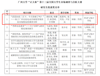 参赛项目《“清晨扣齿三百下,今天你刷了吗?”——基于广州市的电动牙刷使用现状及市场情况的调查分析》获得国赛二等奖。