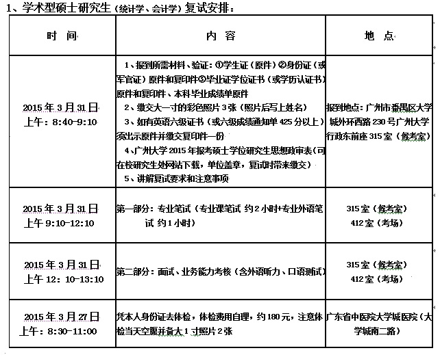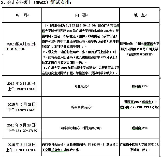 采取差额复试的办法,初试成绩达到A类国家线第一志愿报考专业的,按照一定的差额比例确定复试资格名单;本学院2015年学术型研究生录取指标4个,专业学位研究生(会计专业硕士 MPACC)录取指标50个。