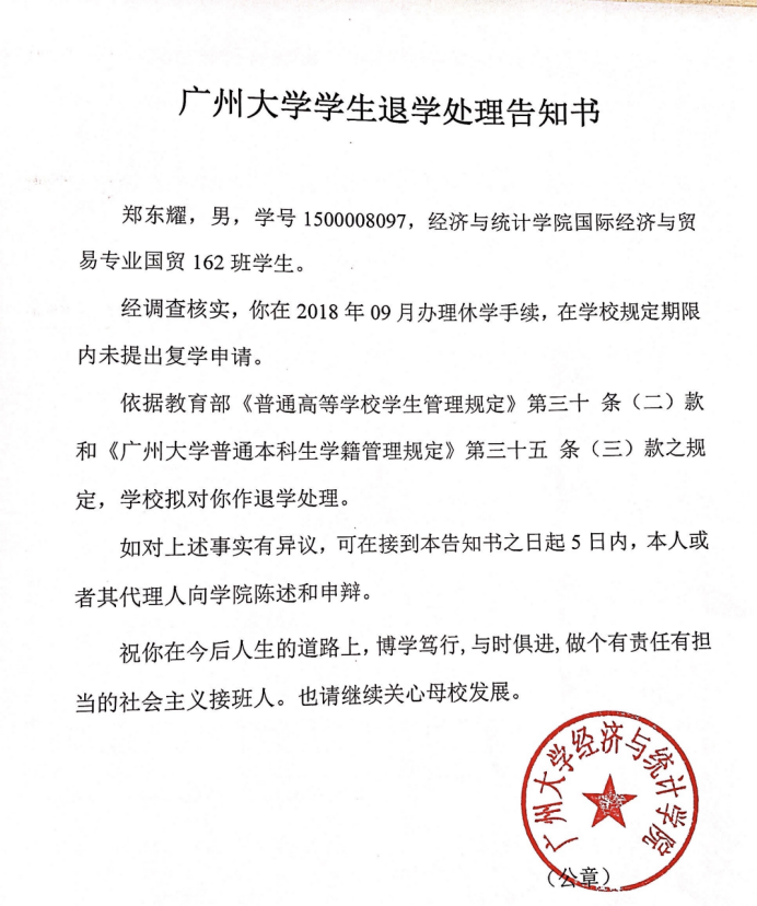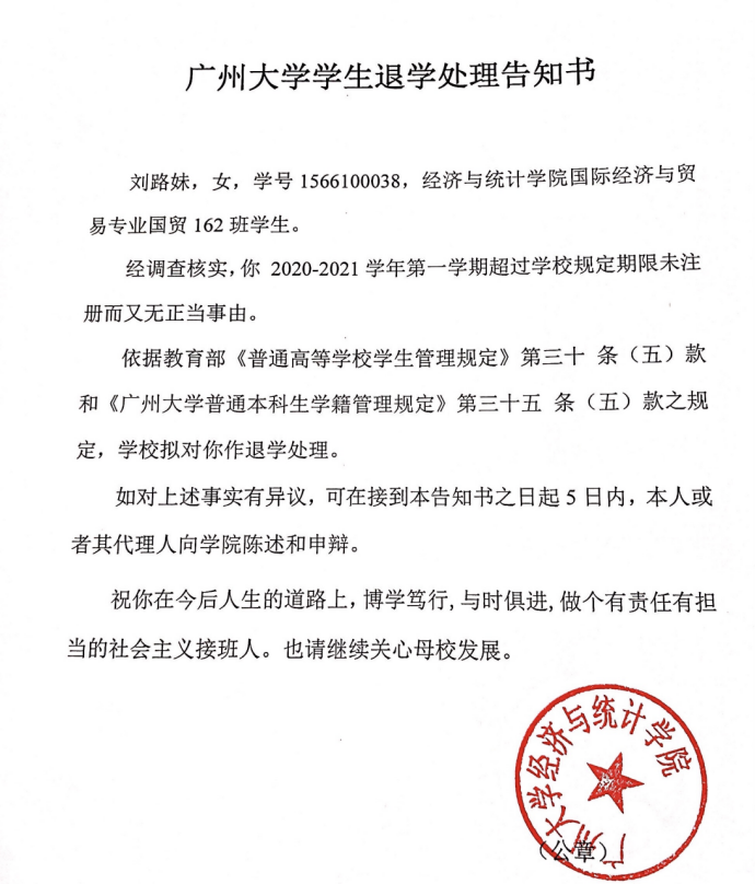 普通本科生学籍管理规定第三十五条(五),超过学校规定期限未注册,而又未办理暂缓注册手续者应予退学(联系不上特此公示告知)。