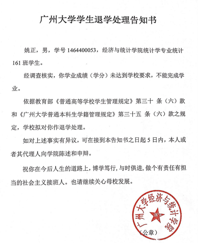 普通本科生学籍管理规定第三十五条(六),学业成绩(学分)未达学校要求,不能完成学业者应予退学。