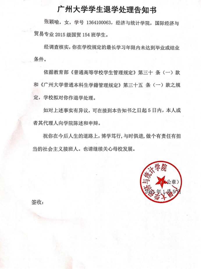 经调查核实在学校规定的最长学习年限内未达到毕业或结业条件。依据教育部《普通高等学校学生管理规定》第三十 条(一)款和《色漫网 普通本科生学籍管理规定》第三十五 条(一)款之规定,学校拟对该生作退学处理。
