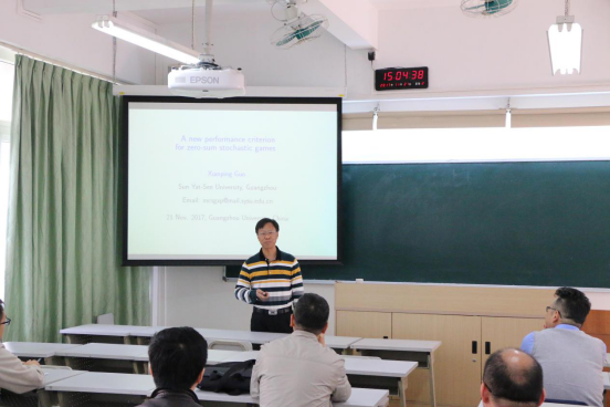 岭南统计科学研究中心的邀请,中山大学数学学院郭先平教授在文清楼518作了题为“A new performance criterion for zero-sum stochastic games”的讲座,旨在进一步提高年轻学者及研究生对研究的理解。此次讲座由李元教授主持,相关专业的师生参加了此次讲座。