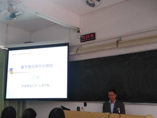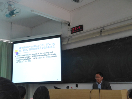 (大学城校区)文新楼222,华南师范大学温忠麟教授作了题为“因果关系中的第三者----调节变量和中介变量”的学术报告——暨“羊城讲坛”第六十三讲,旨在进一步提高年轻学者及研究生对相关研究的理解。此次讲座由熊健老师主持,相关专业的师生参加了此次讲座。