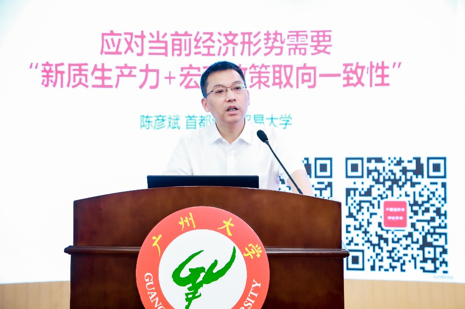 陈彦斌教授作题为《应对当前经济形势需要“新质生产力+宏观政策取向一致性”》的演讲。他表示,当前我国经济出现回升趋势,同时面临有效需求不足、企业经营压力较大、重点领域风险隐患较多等诸多挑战,从短长期有机结合的视角考察新质生产力对经济增长的作用,发现由于新质生产力对经济波动的缓冲作用有限、形成周期长和市场接受度需要时间等特性,新质生产力在长期显著推动了经济增长,而短期内作用有限,据此提出兼顾实现当前经济稳定与长期经济高质量发展需要使用适当的应对政策,关键在于采取“新质生产力+宏观政策取向一致性”的政策组合。