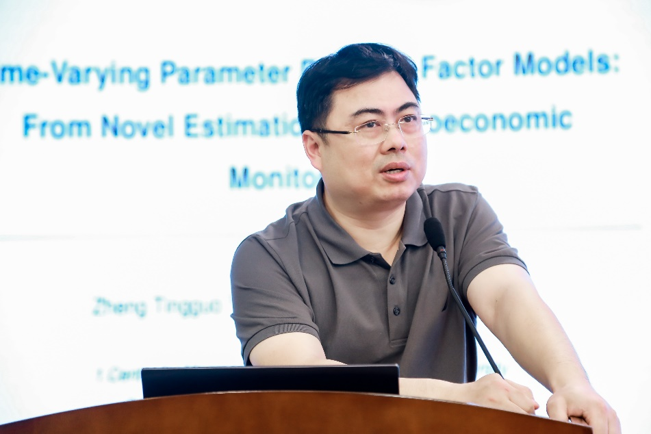 郑挺国教授作题为《Time Varying Parameter Dynamic Factor Models: From Novel Estimation to Macroeconomic Monitoring》的演讲。他基于线性非高斯状态空间模型的形式表示,利用准极大似然估计法,估计时变参数动态因素模型的未知参数、公共因子和时变因子载荷,并通过比较估计量的有限样本性能和样本内拟合性能,检验该估计方法的有效性。随后,分别使用基本和简约的时变参数动态因素模型,从低维度和高维度以及实时数据丰富的环境中实证测量中国经济状况,体现理论和实践的有效结合,为经济学方法和工具的创新以及实践应用提供了新思路。