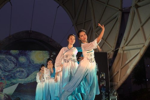 接下来便是民舞队和朗诵组合作演出《茉莉花》,情感饱满的朗诵、优美的舞蹈配合着轻柔的音乐,让观众心旷神怡。