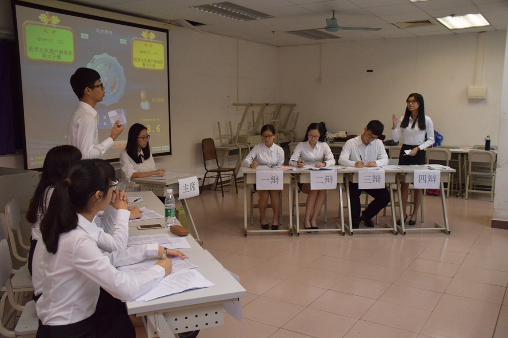 第一场比赛在407课室进行,邀请了物电学院黄峥师兄、工商学院邹睿琪师姐和经统学院的李洵仪师姐担任评委,以“世界文化遗产商业化究竟是利大于弊还是弊大于利”为辩题。正方会计161、162班率先抛出“商业化使文化遗产不再束之高阁,能为文化遗产的保护提供资金”的观点,反方金融161、164班毫不示弱,以“商业化将使文化遗产遭到破坏”的观点,从物质和人文方面进行反击,现场气氛火热。