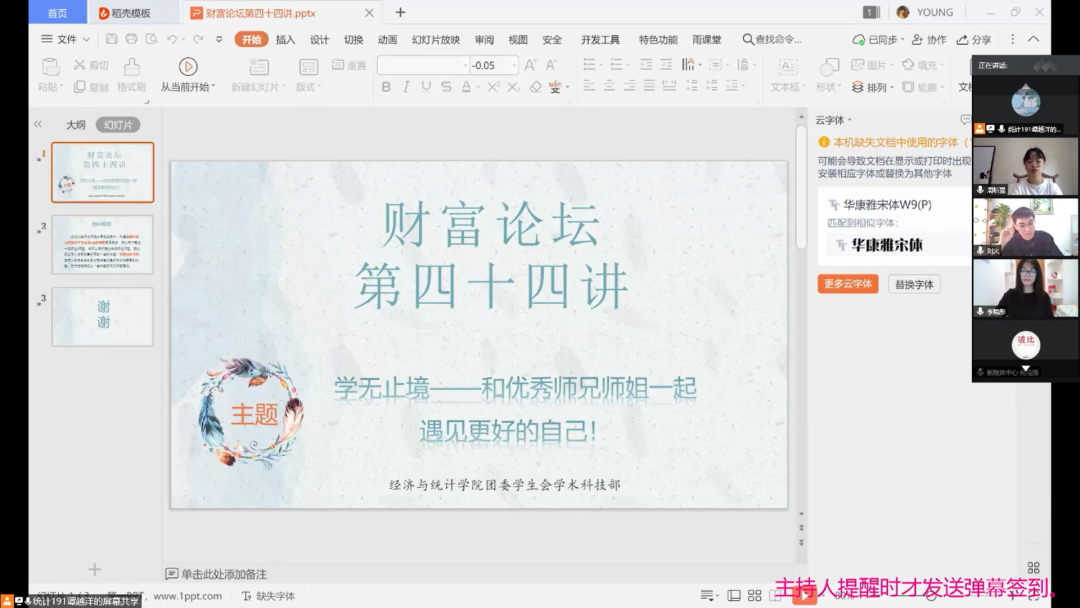 于2020年6月13日下午14时整,在腾讯会议平台展开了以“学习无止境——和优秀师兄师姐一起,遇见更好的自己”为主题的财富论坛活动,此次活动也在哔哩哔哩平台同步直播,累计收获过万名校内外各界人士的关注。