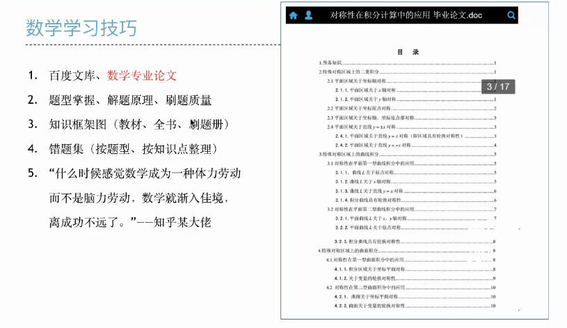 第一,关于数学学习,教材推荐(数一):同济第七版高数教材、同济第六版线代教材、浙大第四版概率论教材。在教材的选择方面,建议先大致翻阅市面上比较出名的全书,再结合自己的情况做出选择。线代方面,知识点一定要串成线。这里推荐李永乐老师的视频,建议结合线代教材整理知识点框架。做题的时候全书上没有找到的点,看完翻回教材基本都能找到。高数方面,建议用汤家凤老师视频打基础,用张宇老师视频拔高。如果遇到看教材看全书也无法解决的数学题型或知识点,可以考虑去百度文库查找是否有总结对应题型与解题方法的数学论文。概率论方面,师姐比较推荐张伟老师的概率论强化视频。