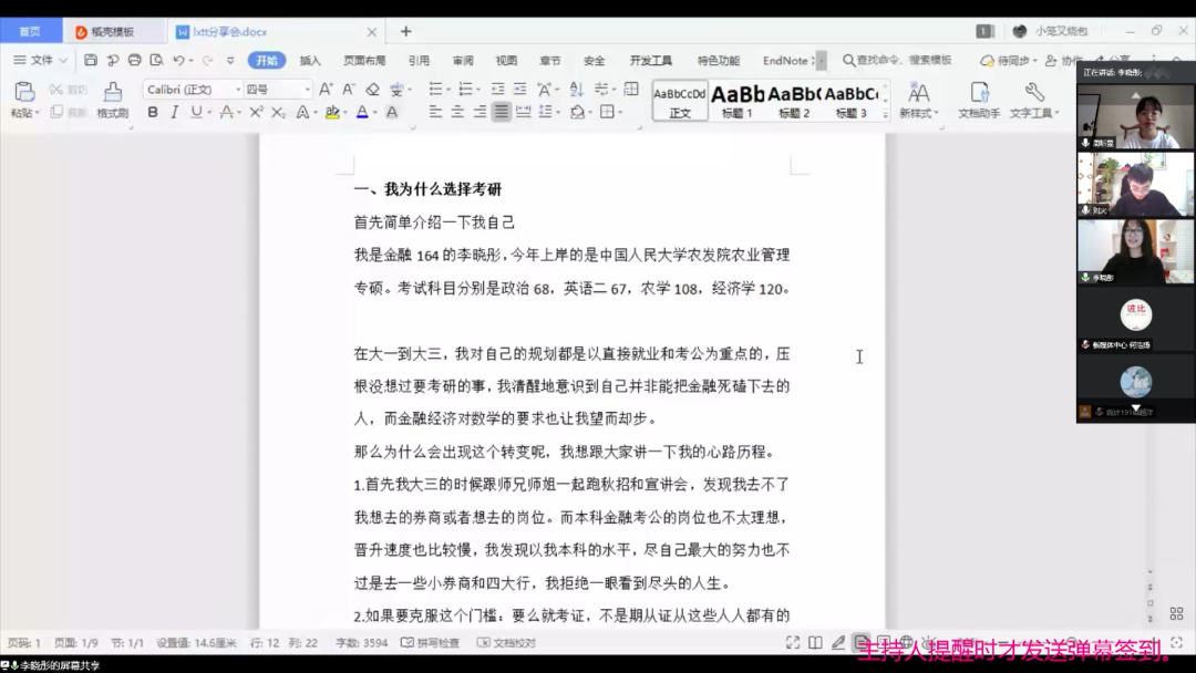 第三位演讲者是成功上岸中国人民大学的李晓彤师姐,她从“为什么选择考研?”、“最大化利用时间”、“弯路警告”、“考不上怎么办?”四个方面为同学们介绍了自己的考研经历。