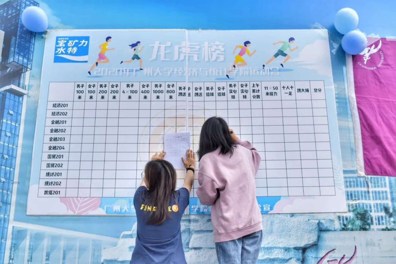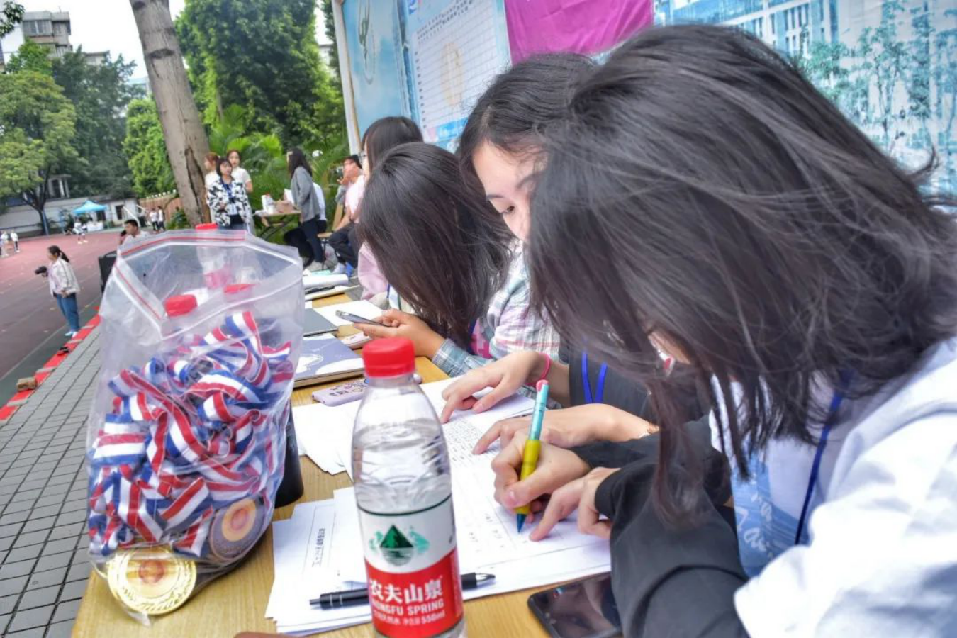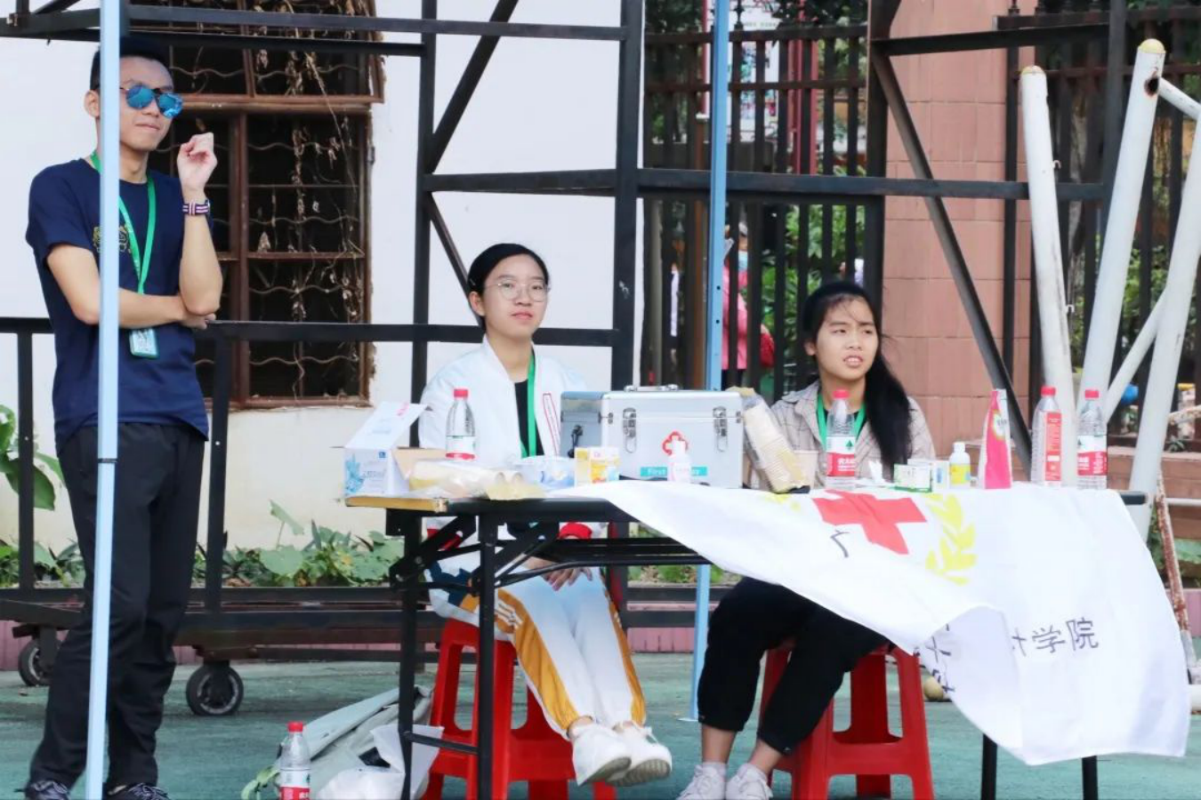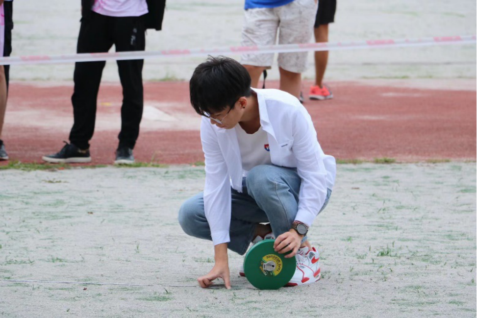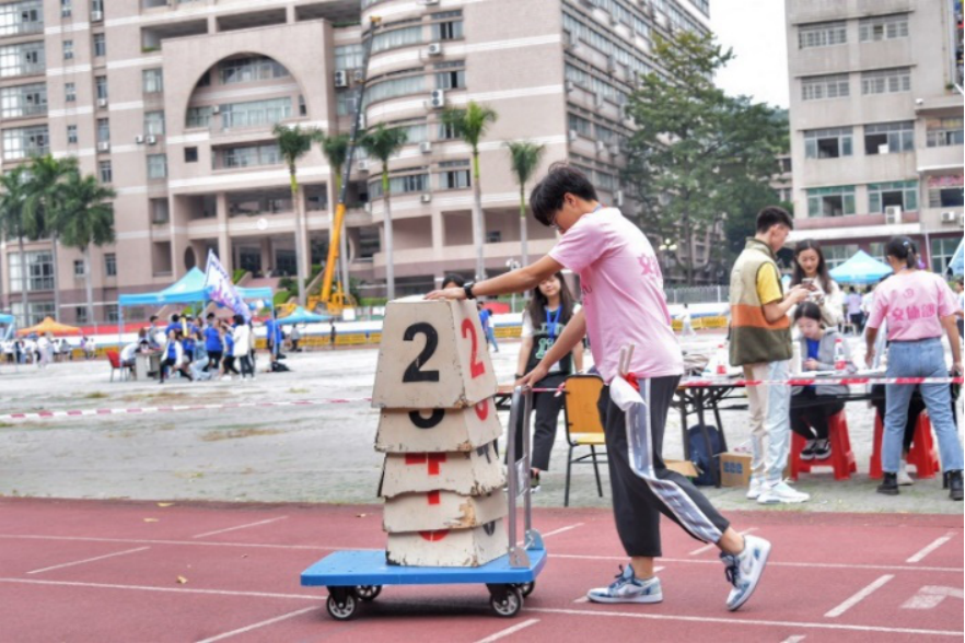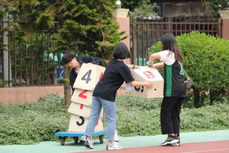 布场搬运的工作人员,在拂晓之时已然站在田径场上,搬运物资、挂举院旗、布置收拾场地,田径场上也有他们挥洒的汗水。