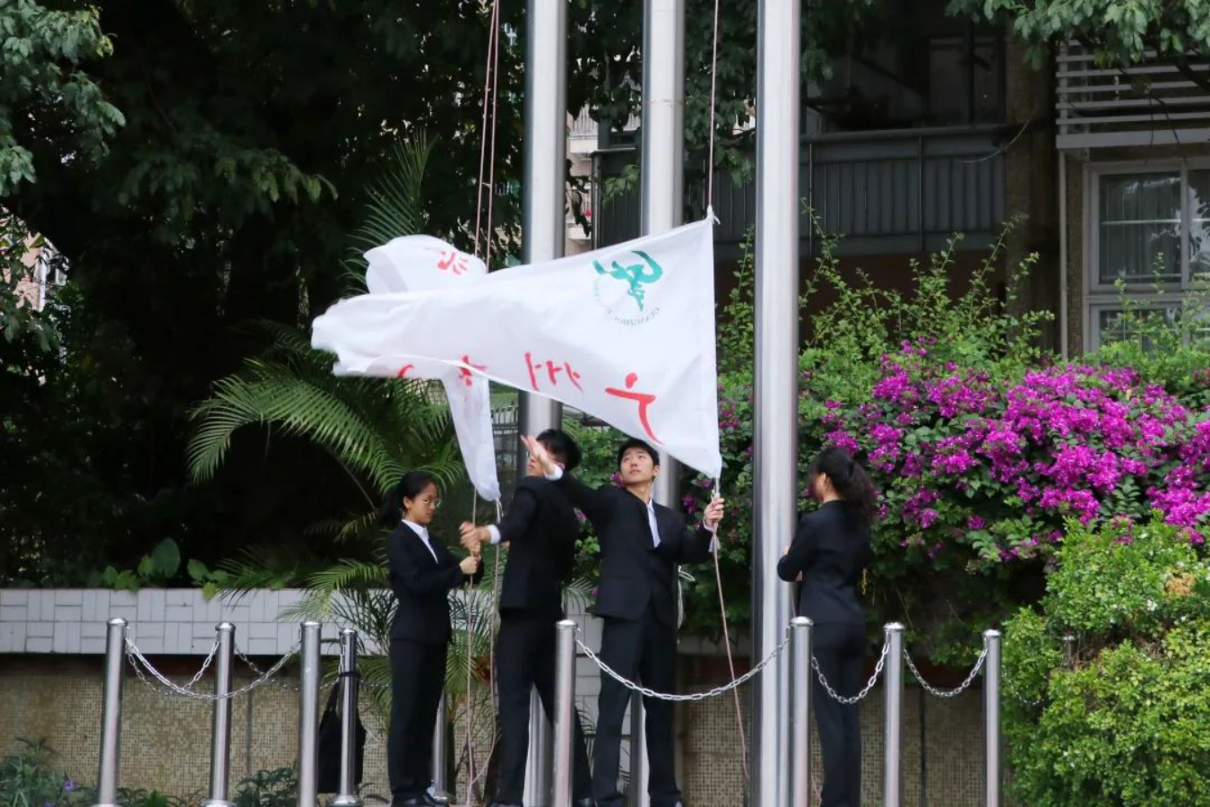 亮丽的旗帜在他们的牵拉下随音乐缓缓升起,随着音乐的停止,旗帜精确达顶飘扬,是他们无数次练习的收获,是运动会最精彩的开场。