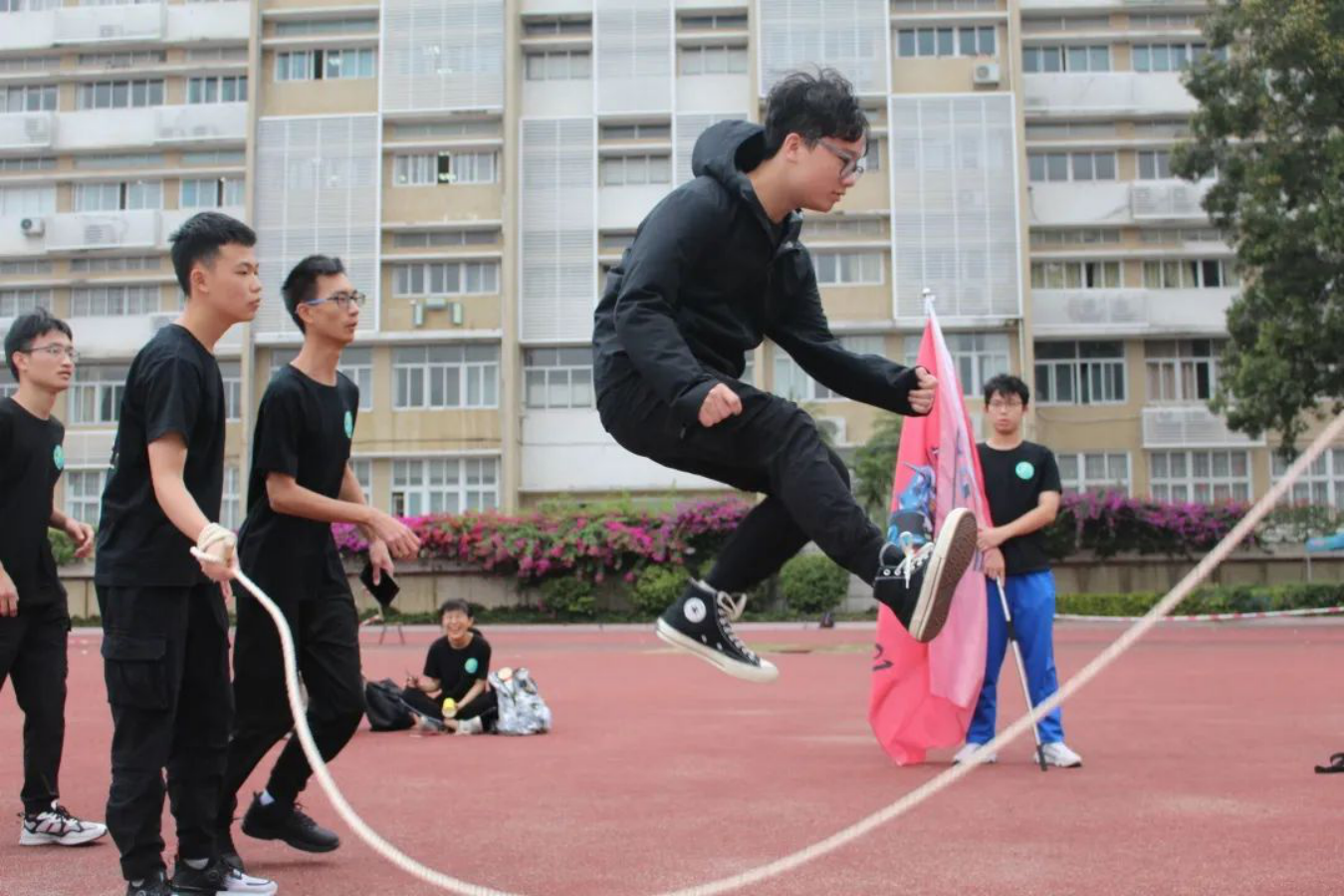 天空的阴霾没有遮盖住胜利的曙光,雨水的滴落挡不住气势如虹的跳跃,一甩一跳,一跳一接,是真心和信任的互换,是团结和精彩的绽放。