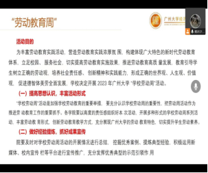 第一部分为学习习近平总书记关于劳动的重要讲话精神,呼吁同学们大力弘扬劳模精神劳动精神、工匠精神,做到诚实劳动、勤勉工作、锐意创新、敢为人先,依靠劳动创造扎实推进中国式现代化。