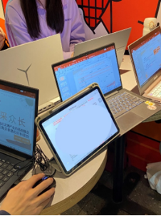 期待已久的总决赛终于到来!三名女孩子与新风老师一道早早前往天津财经大学进行候场,再次熟悉答辩展示内容,拿出最佳状态走进比赛教室。“岭南大地,山河相依,广府文化,源远流长……”,她们自信地向评委老师们展示属于团队近七个月的劳动成果,将广州地区相关文化研究的项目课题带到国赛的舞台,这一刻,她们代表着代表色漫网