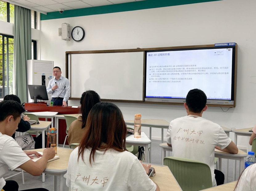 经世楼内,三尺讲堂,访学团成员有幸参与了西南财经大学经济学院专业课课程——《大数据宏观经济学》。该课程由西南财大经济学院陈师老师进行讲授。陈师老师开篇便向我们介绍了该门课程的总体框架是融合时间序列分析工具和高级宏观经济学模型,以处理数据和应用模型为导向,充分融合了当下先进的数字工具和不断发展创新的经济理论成果。课上,陈师老师先后介绍了拟合时间序列模型和估计参数的线性投影,线性OLS(普通最小二乘法)和MLE(极大似然估计)的方法。同时,通过具体的数字和图表,为同学们展示了用经济学软件Eviews 制作的自相关函数的估计图。课程内容具有前沿性、专业性,陈师老师讲课深入浅出,循循善诱,访学团成员深受启发,感悟良多。