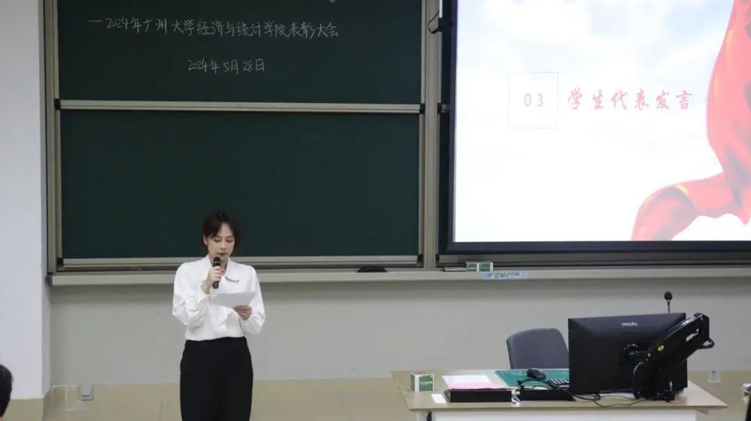 优秀毕业生代表蔡灿辉同学和优秀学生干部代表陈艺莹同学分别上台发言,为同学们分享他们在校期间的学习经历、创业经历、学生干部经历和获奖感想,激励同学们保持孜孜不倦的学习状态和朝气蓬勃的精神姿态,不断提升自己,一往无前,奋勇争先。