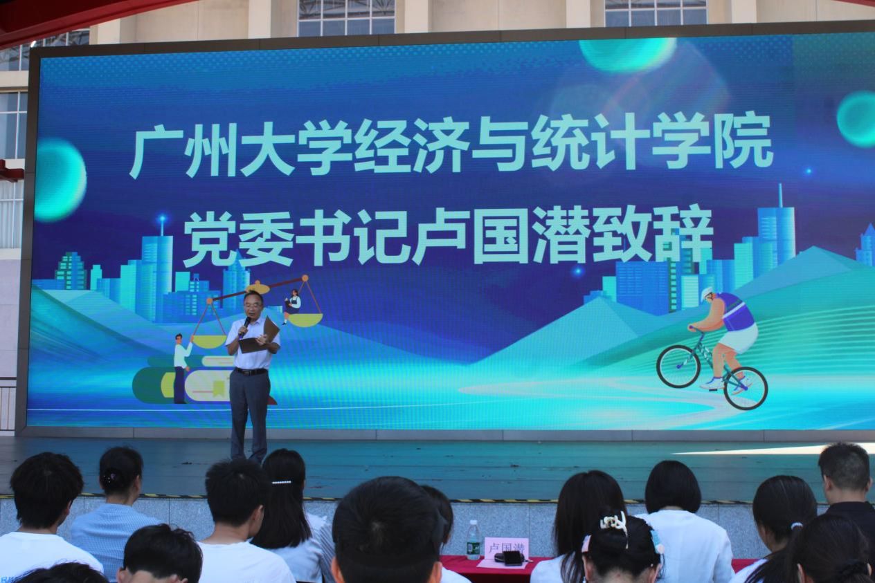 党委书记卢国潜致辞,卢书记分析了统计工作目前面临的风险和挑战,希望同学们能够通过此次活动增强遵守《统计法》的自觉性,在日常学习生活中不断追求真理、探索未知、勇于创新,为学校的高质量发展和社会的统计法治建设贡献力量。接着,陈队和卢书记分别将活动旗帜和横幅交接给骑行选手代表。最后,所有的领导、嘉宾、老师以及学生代表共唱校歌。