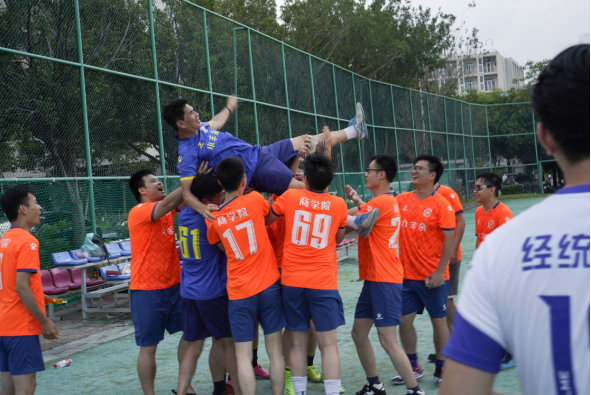 比赛双方球风和特点都十分接近,上半场双方都比较保守,节奏较慢,比赛来到上半场12分钟,商学院中路组织进攻,分球右路,15号接队友传球大禁区边缘射门,打门角度较正,被对方门将神勇扑出。仅仅过了2分钟,商学院0号球员大禁区边缘突施冷箭,远射破门。半场结束1415经统联队0:1商学院。下半场开始,商学院队逐渐控制场上局面,不停向对方门发起进攻。下半场6分钟门前出现险情,1415经统联队门将神勇两连扑化解,随后商学院角球开出,由10号球员冲顶破门,经统0:2商学院。终场前,商学院卷土重来,右路突破下底传中,中路11号球员无人防守,轻松推射破门,打入锦上添花的一球。终场哨声响起,最终比分1415经统联队 0:3 商学院。