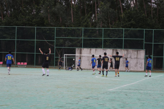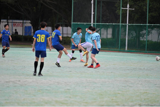 商学院开局较早进入比赛节奏,不断前场逼抢,抓住对方中场球员失误,形成抢断反击,由80号球员跟进破门先下一城,商学院1:0领先13经统联队。此后经统球员不断反扑,禁区外挑射吊门险些破门,半场结束商学院领先一球。易边再战,商学院24号球员禁区造险引发混战,门将扑出。商学院后防解围失误,经统14号球员打门偏出。比赛最后阶段,经统14号球员抓住机会反击,左路快速突破过人,面对门将推射远角破门,追平比分! 终场哨声响起,双方比分定格在13经统联队 1:1 商学院。