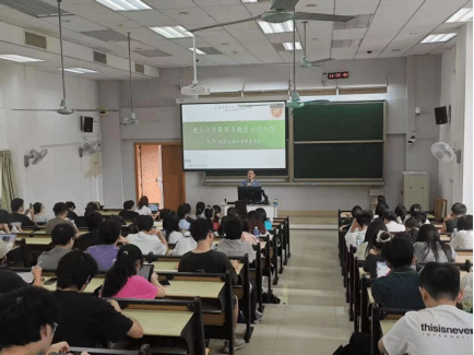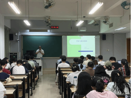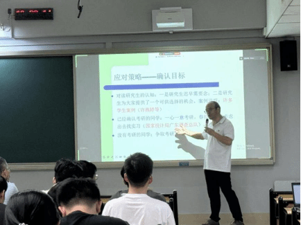 学院副院长李正辉从当前学生面临的“专业与职业脱钩”“考研就业双向焦虑”等现实矛盾出发,指出职业规划应尽早启动、动态调整。他引用近几年学院毕业生的发展案例,深入分析就业市场现状,他强调"学历提升不是终点,而是能力进阶的起点",鼓励同学们结合个人兴趣与长远发展规划,理性评估、提前布局,为未来学术生涯和职业发展筑牢基础。
